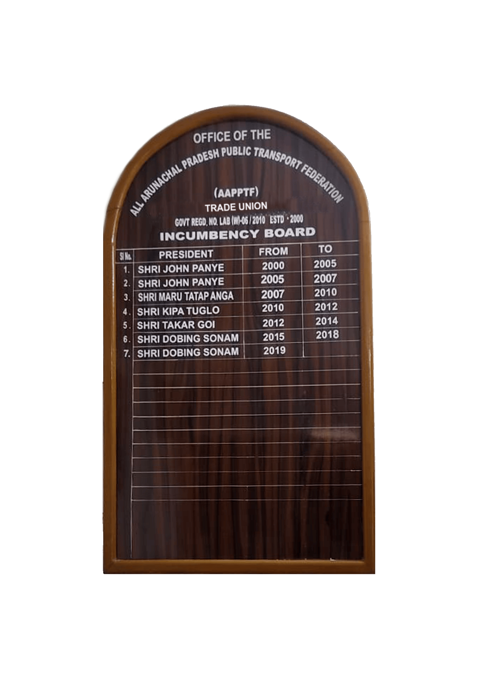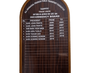In the year 2008, Shri Dobing Sonam assumed the esteemed position of State General Secretary of the All Arunachal Pradesh Public Transport Federation(AAPPTF),backed by the unwavering love and support of leaders from various transport unions and the dedicated transport workers across the state. His appointment marked a turning point in the federation’s journey, ushering in a new era of unity, advocacy, and progress for the transport community. Under his steadfast leadership, AAPPTF has grown in strength and influence, consistently championing the rights and welfare of transport workers. Shri Sonam’s enduring commitment and visionary guidance have earned him deep respect and trust, allowing him to serve in this role with distinction to this day. His continued leadership stands as a testament to his tireless eff orts and the collective faith the transport fraternity places in him. During the year 2008, the All Arunachal Pradesh Public Transport Federation (AAPPTF) witnessed a period of dynamic leadership and committed service under the stewardship of Shri Dobing Sonam as the State General Secretary and Mr. Maru Tatap Anga as the State President. Their tenure marked a significant chapter in the federation’s history, characterized by a shared vision and tireless eff orts to uplift the transport fraternity across the state.