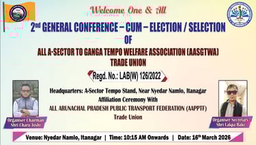 Today, 16th March 2026, the 2nd General Conference cum Election/Selection of the All A-Sector to Ganga Tempo Welfare Association (AASGTWA) Trade Union was successfully held at Nyedar Namlo, Itanagar. The programme was also conducted in affiliation with the All Arunachal Pradesh Public Transport Federation (AAPPTF) Trade Union.