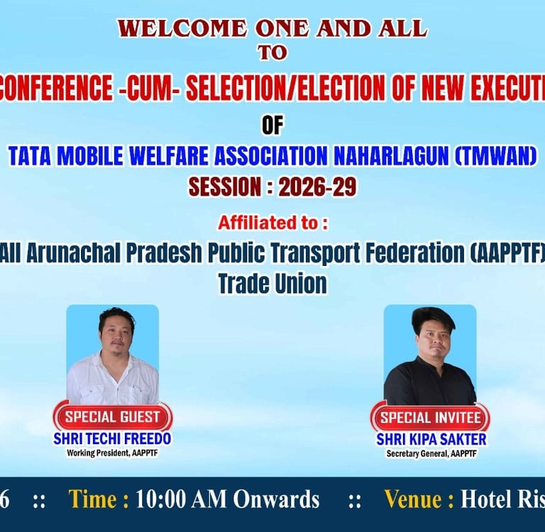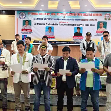 Today, on 21st March 2026 at Hotel Rising Sun, Bara pani (Naharlagun), I had the honour to attend the 7th General Conference of Tata Mobile Welfare Association Naharlagun (TMWAN) as the Chief Guest in my capacity as State President of All Arunachal Pradesh Public Transport Federation (AAPPTF) Trade Union.